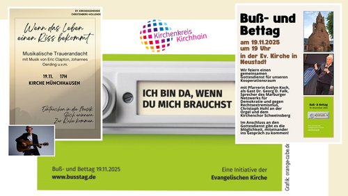 Im Kirchspiel Christenberg-Hollende bettet Pfarrer André Barth den Buß- und Bettag in die Woche zwischen Volkstrauertag und Ewigkeitssonntag ein und gestaltet – als Pfarrer und Musiker – eine ganz besondere Andacht zum Thema Trauer. "Wenn das Leben einen Riss bekommt." In der Kirche Münchhausen wird es keine Kirchenmusik zu hören geben, sondern moderne Popsongs, die sich mit Tod, Trauer und Abschied beschäftigen – zum Beispiel „Tears in heaven“ von Eric Clapton oder Herbert Grönemeyer’s „Der Weg“.